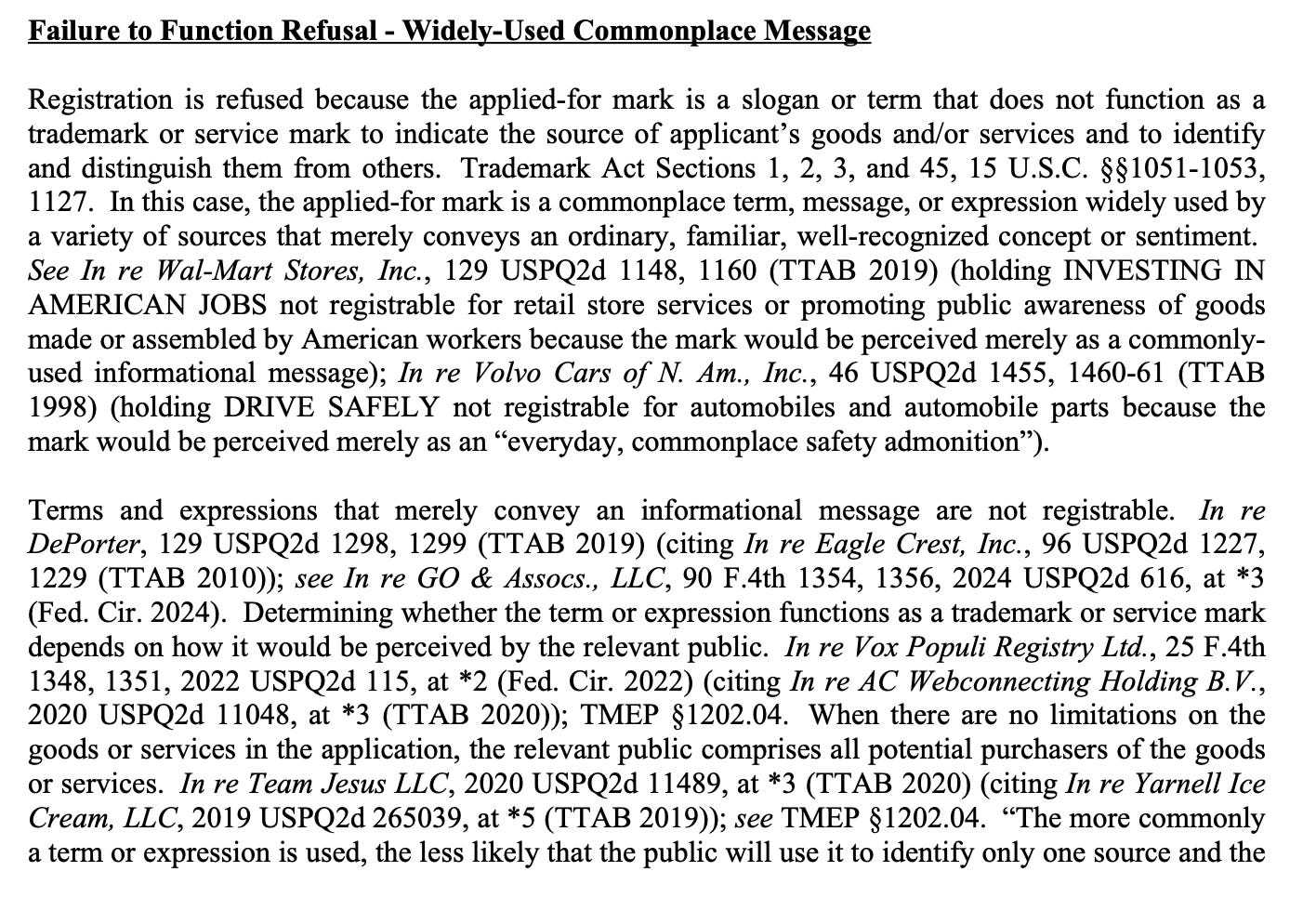Well, it turns out they were denied on the basis of LFGSD being a “widely-used commonplace message”. The same response I imagine I would get if I tried to trademark the word “beach”, although a bit less obvious.
