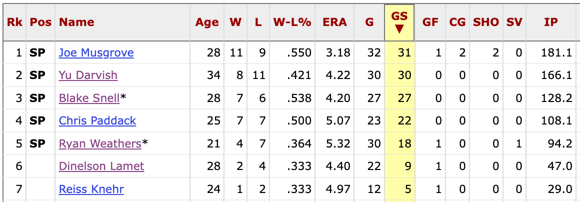 It would have be difficult (if not impossible) for the Padres to get to 900 innings thrown by their starters because they had so few starters to begin with. To compare, the Dodgers had 8 pitchers starter 5 or more games. The Giants had 7, as did the Padres, but San Diego only got there by including Dinelson Lamet. Lamet wasn’t a starter last year, as much as he was an opener.