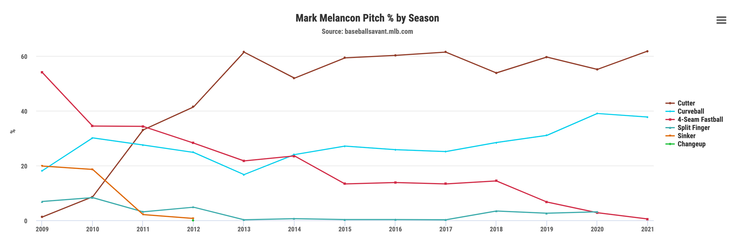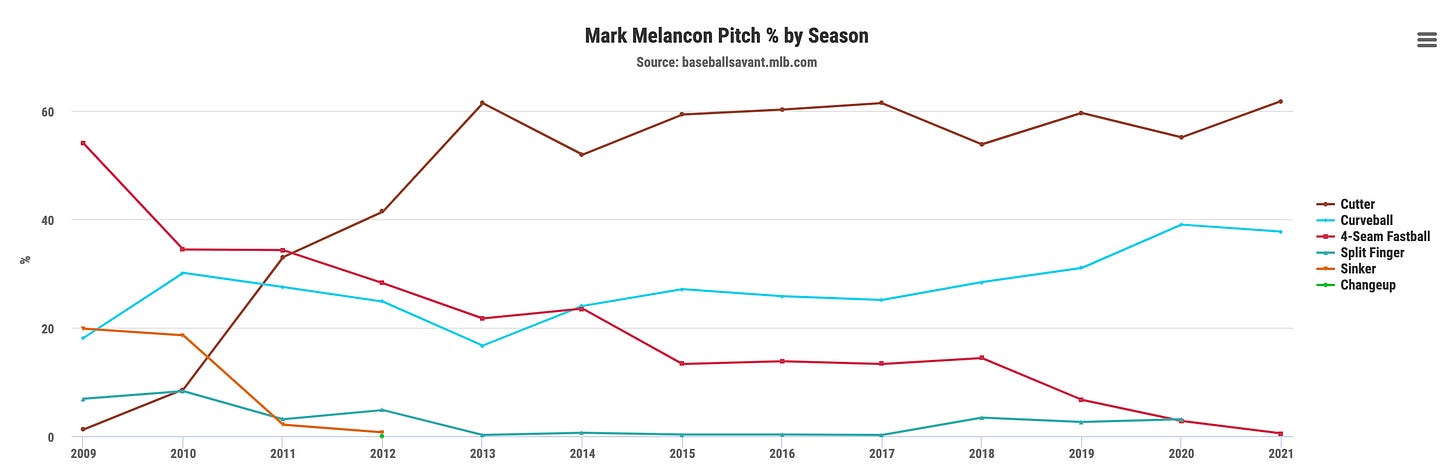You get the idea. His cutter has always been his main pitch, and remains so, but now Melancon is throwing more curveballs and less of everything else.