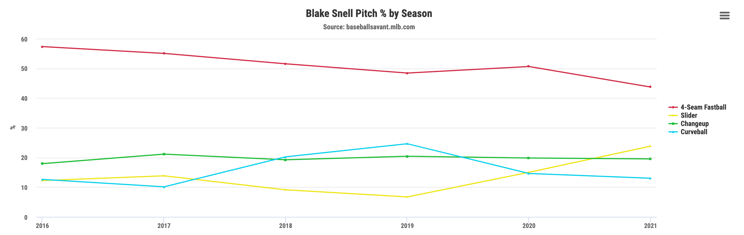 The closest season to what he’s doing in 2021 is what he did in 2017, the year before he won the Cy Young, but I like this chart for another reason: It helps us identify what the problem is.