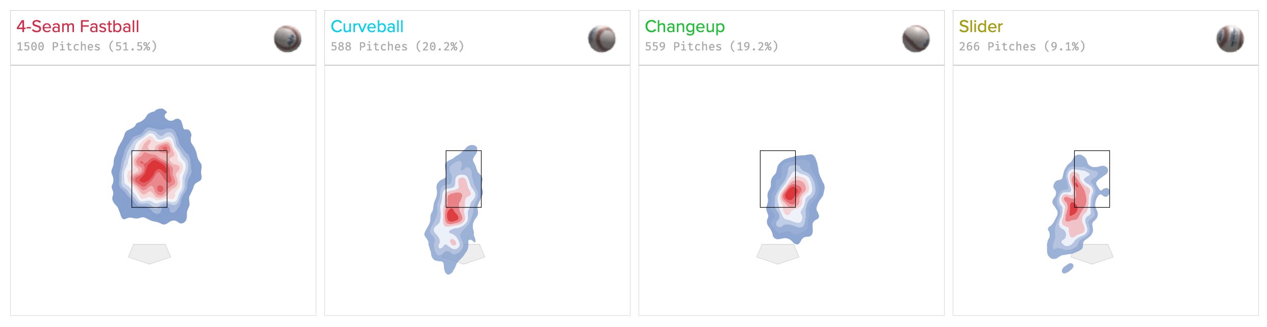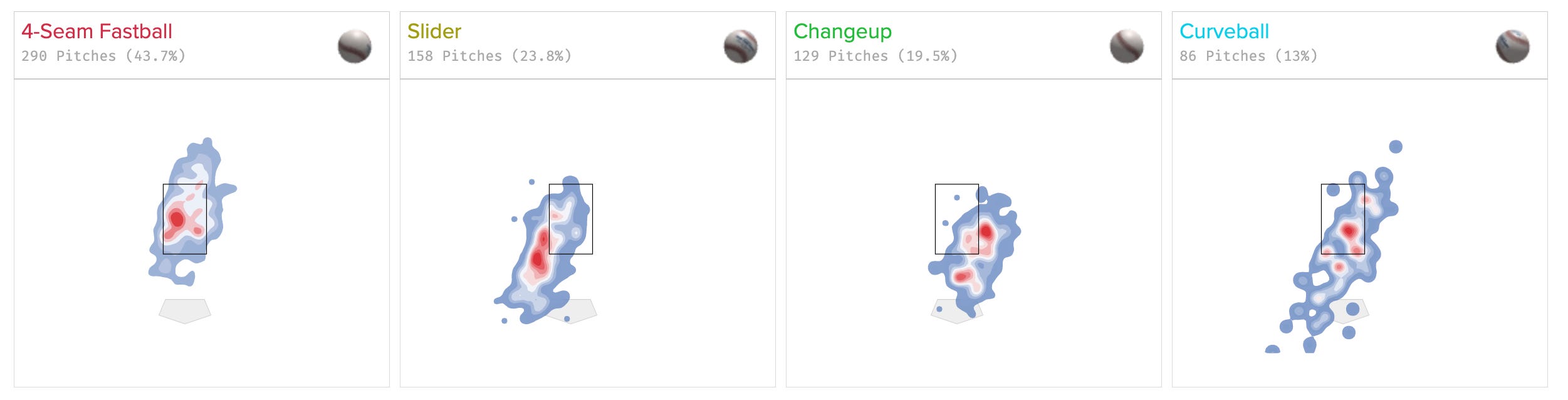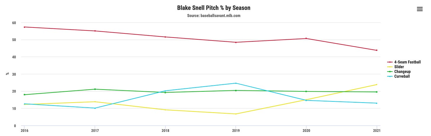 Let’s start here. Blake is throwing his fastball less than he ever has and throwing his slider more than he ever has, more than twice as much as that 2018 season. It’s easy to blame Larry Rothschild for that, but you can see it ticking up dramatically last season already. This is a decision that was made before he came to San Diego.