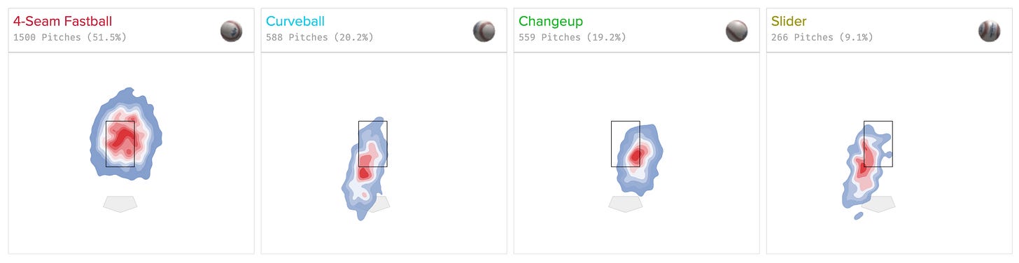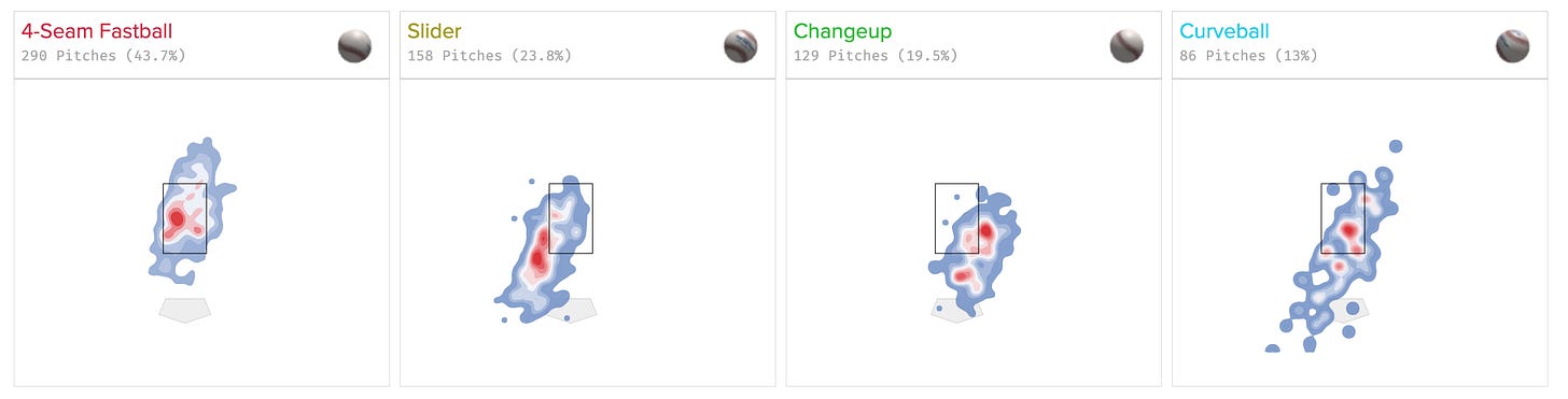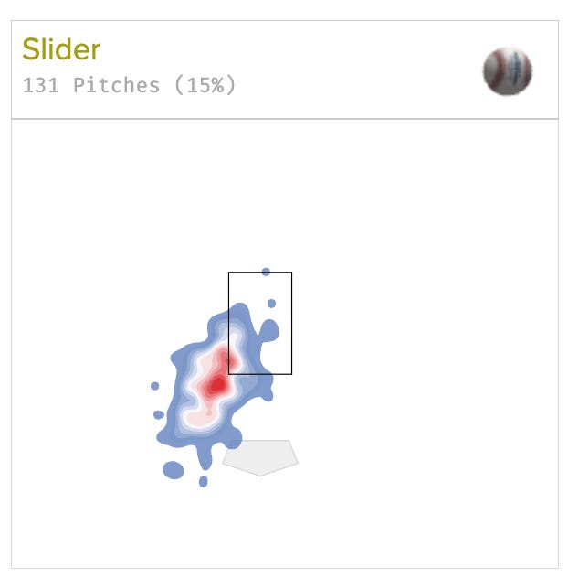 The fastball is less predictable, it looks like he could get guys out throwing it towards the top of the strike zone, but the most important thing here is the slider. He threw it less, although it was equally devastating, but you could see that it was landing just on the inside of the zone instead of just on the outside.