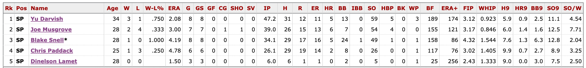 Dig a little deeper and you’ll see that Blake Snell’s FIP really stands out as bad against his teammates, and his WHIP leads the rotation as well. You won’t be shocked to find out these are some of the worst numbers Snell has ever put up in his career.