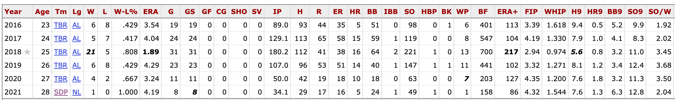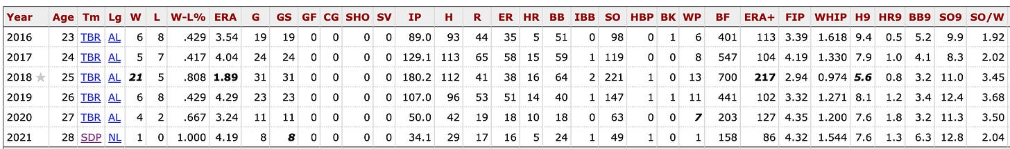 Trading a 21 year old who might some day be at Blake Snell’s level, no guarantees, for Blake Snell seemed like a no-brainer to me. And throwing in a couple of low-level prospects, along with Francisco Mejia (whose Padres career was a failure), seemed like a fine price to pay to get an ace.