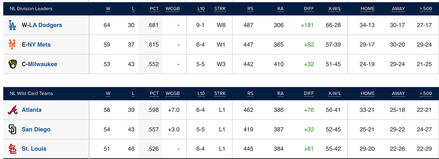 First of all, look at the Padres’ record against teams that are above .500 and then compare that to the Dodgers. The Padres might actually be built to win in the playoffs, when pitching matters more, but they need to start beating the good teams now if they’re going to make it that far.