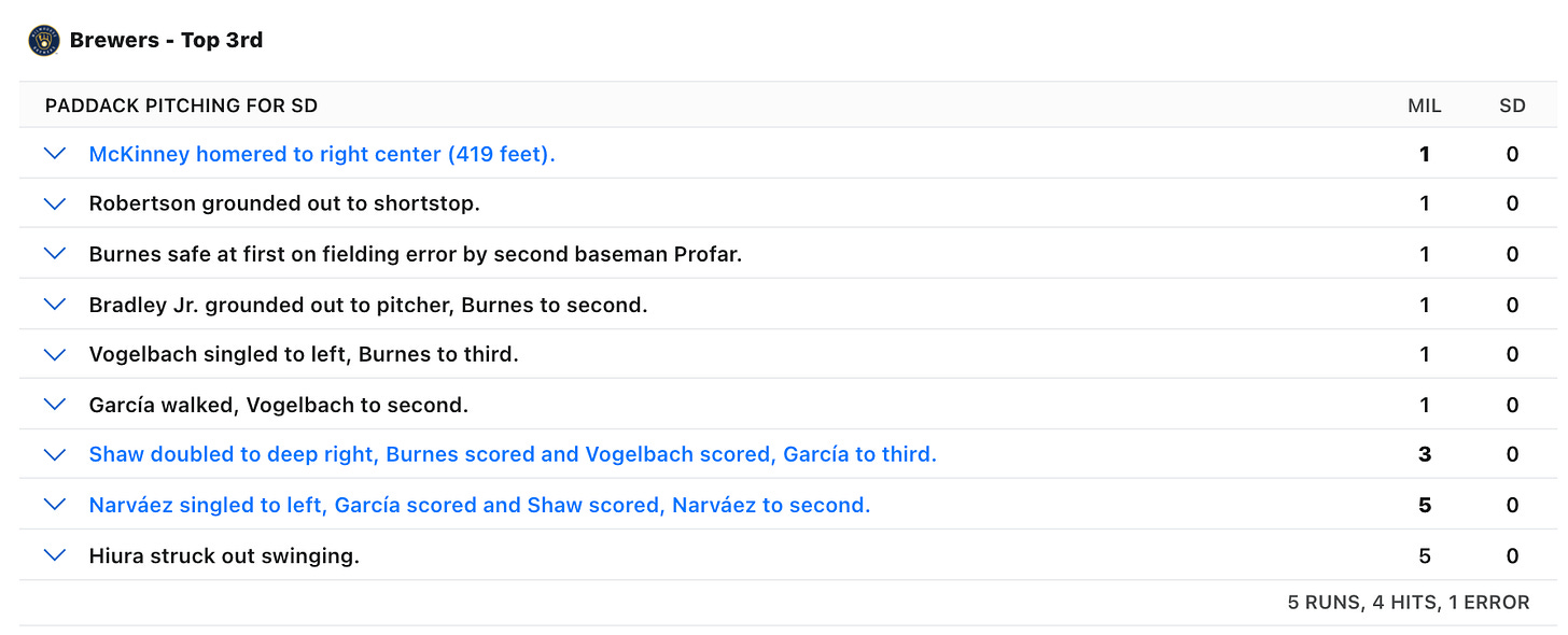 Paddack pitched great in innings 1, 2, 4, and 5 last night. Unfortunately, that third inning went sideways after a leadoff home run and a Jurickson Profar error:
