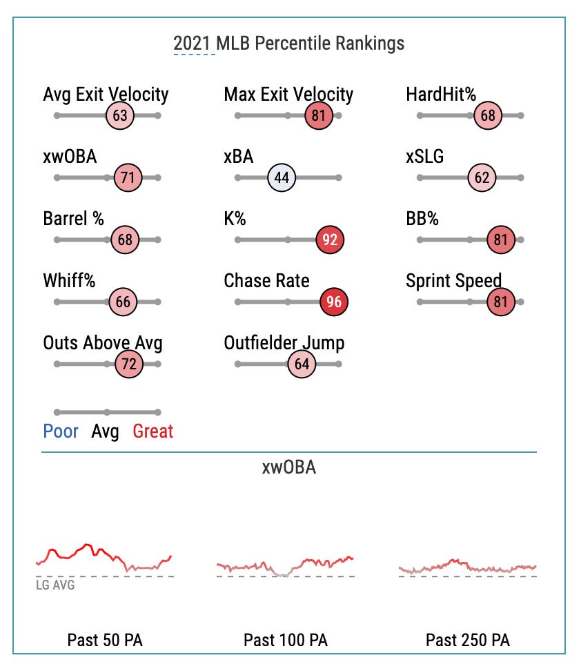These are great numbers! Pham is completely in control, only swinging at strikes and barreling most of them. That should lead to him having a stellar offensive start to the season, but instead his slash line is .128/.286/.128.