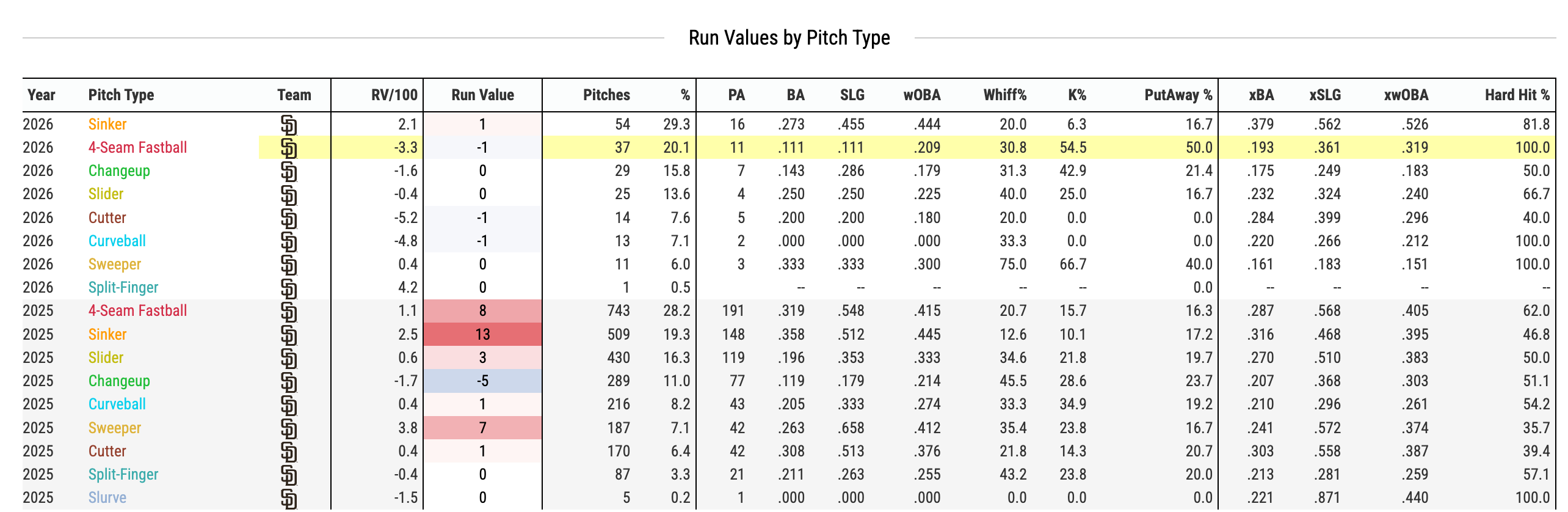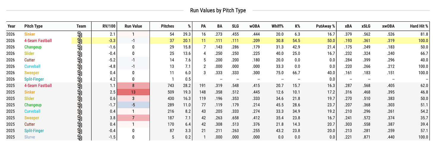 YIKES. Also, verified. For whatever reason, Tatis can’t hit 4-seam fastballs right now. Pitchers are starting to catch onto it and they’re going to that pitch when they need a swing-and-miss from Tatis.